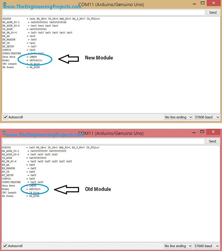 W tym szkicu, po prostu wyświetlam szczegóły modułu NR24L01. Zatem załadowałem powyższy szkic w obu Arduino, jeden ze starym modułem NRF24L01 i jeden z nowym, po czym otrzymałem poniższą odpowiedź.