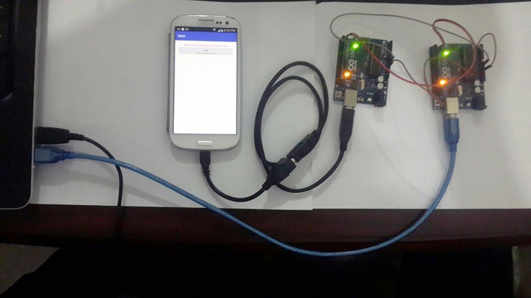 Teraz ustanówmy komunikację USB pomiędzy Androidem i Arduino. Mam nadzieję, że do tej pory skonfigurowałeś telefon z systemem Android i oba Arduino tak, że ogólnie będą wyglądać tak jak poniżej: