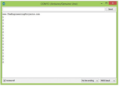 Teraz, gdy nacisnę przycisk na aplikacji Android, wyśle 1 lub 2 do Arduino, co jest pokazane na poniższym rysunku: