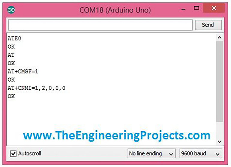 Teraz wiemy, że wysłaliśmy wszystkie cztery komendy AT i nasz ekran GSM jest gotowy do odbierania wiadomości tekstowych i poinformuje nas o tym.