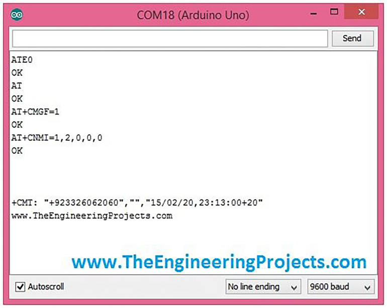 Każda wiadomość odbierana przez moduł SIM900 zaczyna się od "+CMT", po nim znajduje się numer telefonu komórkowego nadawcy, a na końcu treść wiadomości, która w naszym wypadku brzmi "www.TheEngineeringProjects.com"