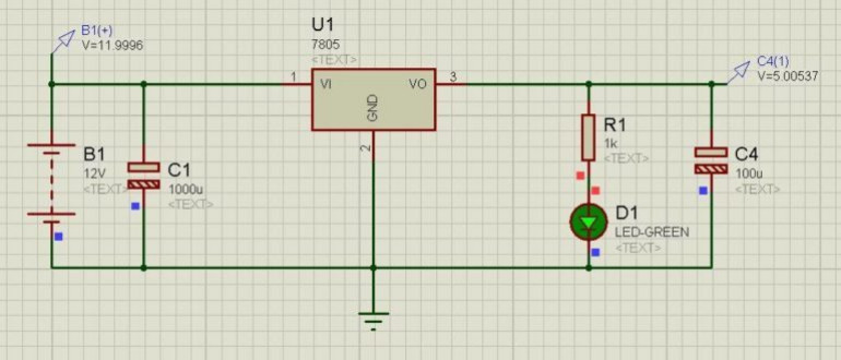 Poleca się przeczytać tekst opisujący jak zaprojektować zasilacz 5 V w Proteusie aby uzyskać lepsze pojęcie o tym regulatorze napięcia. Schemat obwodu zaprojektowanego regulatora napięcia przedstawiono na poniższym rysunku.