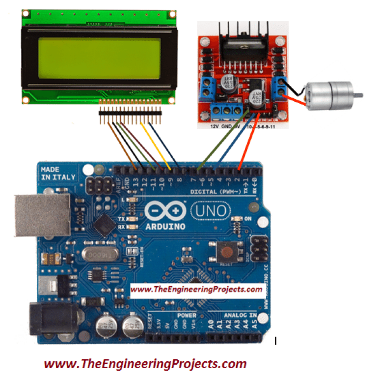 Na powyższym zdjęciu widać, że podłączyliśmy płytkę Arduino UNO ze sterownikiem silnika L298, a następnie podłączyliśmy silnik prądu stałego z Arduino UNO i LCD. Ten ostatni używany jest do pokazywania bieżącego ruchu silnika.