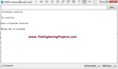 Naciskamy C. Możemy zobaczyć, że silnik prądu stałego obraca się w kierunku zgodnym z ruchem wskazówek zegara, a komunikat Obrót w kierunku zgodnym z ruchem wskazówek zegara zostanie wyświetlone na Monitorze szeregowym.