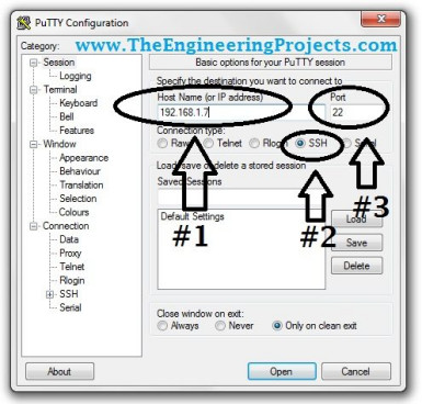 Teraz, po pierwsze wybierzmy SSH, który jest pokazany na powyższym rysunku z oznaczeniem #2, następnie podajmy adres IP naszego Arduino YUN i Port pozostanie 22. Jeśli nie wiemy, jak uzyskać adres IP Arduino YUN, warto przeczytać rozpoczęcie pracy z Arduino YUN.
