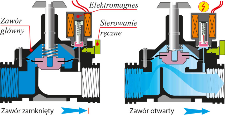 Z kolei fotografia główna pokazuje popularny elektrozawór o takiej budowie. Solenoid – cewka nie kontroluje tu bezpośrednio głównej drogi przepływu wody.