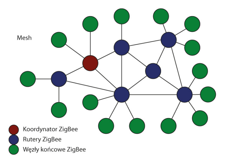 Urządzenia końcowe przesyłają dane zarówno do routerów, jak i koncentratora. Dzięki temu, awaria jednego elementu nie blokuje całej sieci. Koncentrator to urządzenie zbierające dane od wszystkich urządzeń i zarządzające ich pracą. To z nim łączy się aplikacja na telefonie, który z kolei łączy się z nim przy użyciu WiFi lub Bluetooth. Routery przekazują informacje między sobą, urządzeniami końcowymi oraz koncentratorem.