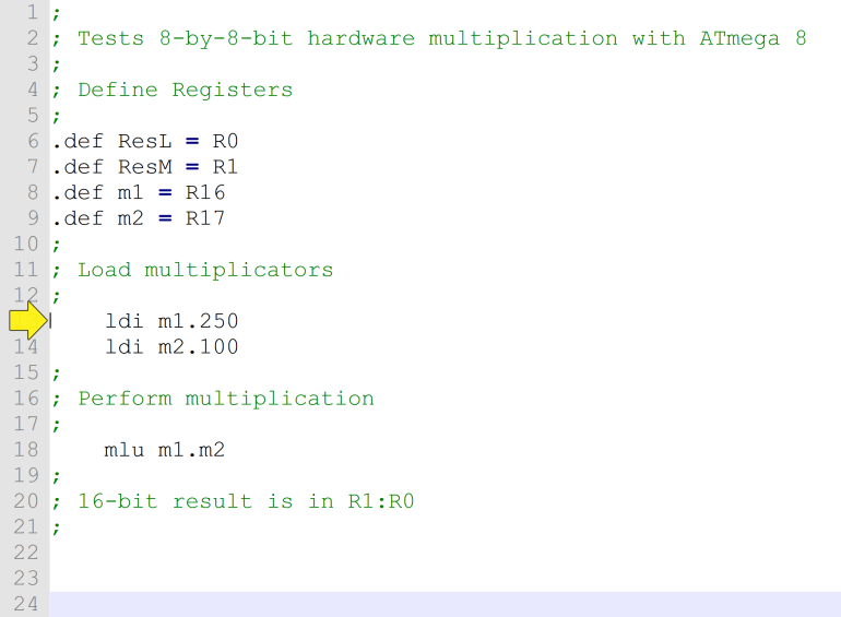 Ten sposób programowania jest najbardziej efektywny i najtrudniejszy zarazem. Jest językiem niskiego poziomu co oznacza, że pisząc program operujemy wprost na poszczególnych rejestrach mikrokontrolera i odwołujemy się bezpośrednio do jego zasobów. Charakterystycznym elementem asemblera są mnemoniki, czyli kilkuliterowe wyrażenia oznaczające daną czynność do wykonania.