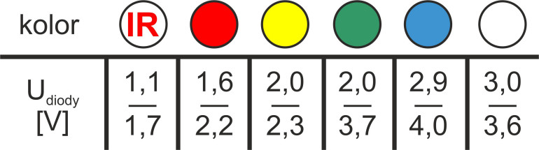 Najniższe napięcie będą miały świecące w podczerwieni (IR) i czerwieni, a najwyższe - na niebiesko i biało.