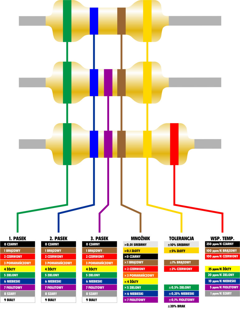 Jak z tego korzystać? Wystarczy ułożyć przed sobą rezystor i rozpoznać kolory pasków na jego obudowie. Może być potrzebna pomoc szkła powiększającego dla tych szczególnie małych elementów.