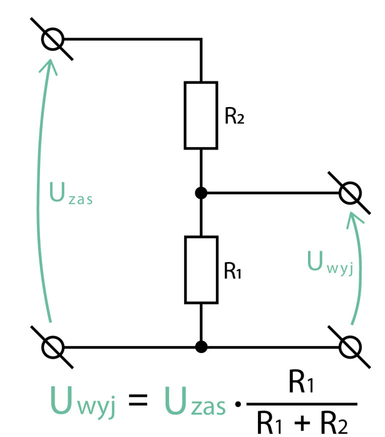 Jeszcze inną strukturą, charakterystyczną dla rezystorów, jest dzielnik napięcia. To układ dwóch (lub więcej) połączonych szeregowo rezystorów. Wejściem dzielnika jest cały szereg, a wyjściem - zaciski wybranego rezystora.