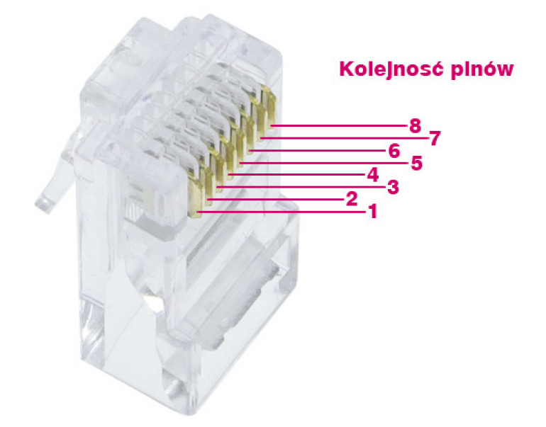 Poukładane żyły należy wsunąć do odpowiednich przegródek we wtyku 8P8C (zwanym też RJ45). Pin nr 1 to pierwszy pin od lewej strony patrząc na wtyczkę od strony pinów: