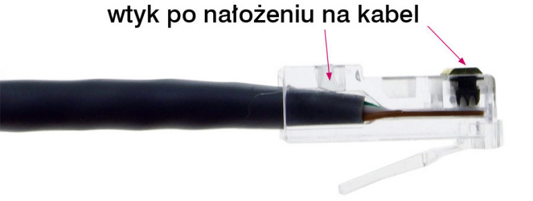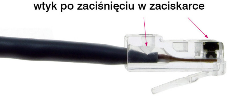 Wszystkie żyły powinny dotrzeć do końca wtyku, równo, bez wyginania się czy załamywania. Jeżeli tak nie jest, należy wysunąć kabel z wtyku, poprawić ułożenie żył i wsunąć go ponownie.