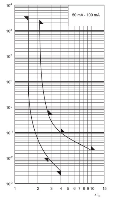 Powodem tego opóźnienia jest konieczność rozgrzania drucika do takiej temperatury, w której ulegnie on bezpowrotnemu spaleniu. Im silniejsze będzie przeciążenie, tym większy prąd popłynie przez bezpiecznik, silniej się on wtedy rozgrzeje i szybciej przepali. Producenci w notach katalogowych swoich wyrobów (tak, bezpieczniki też mają karty katalogowe, niekiedy obszerne!) umieszczają zazwyczaj wykresy obrazujące krotność przeciążenia i czas zadziałania. Przykładowy wykres od firmy ESKA: