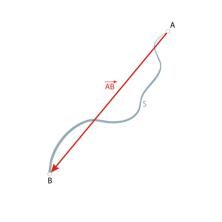 Na powyższym rysunku, A to punkt początkowy, B to punkt końcowy. S to droga, zaś AB jest wektorem przemieszczenia.