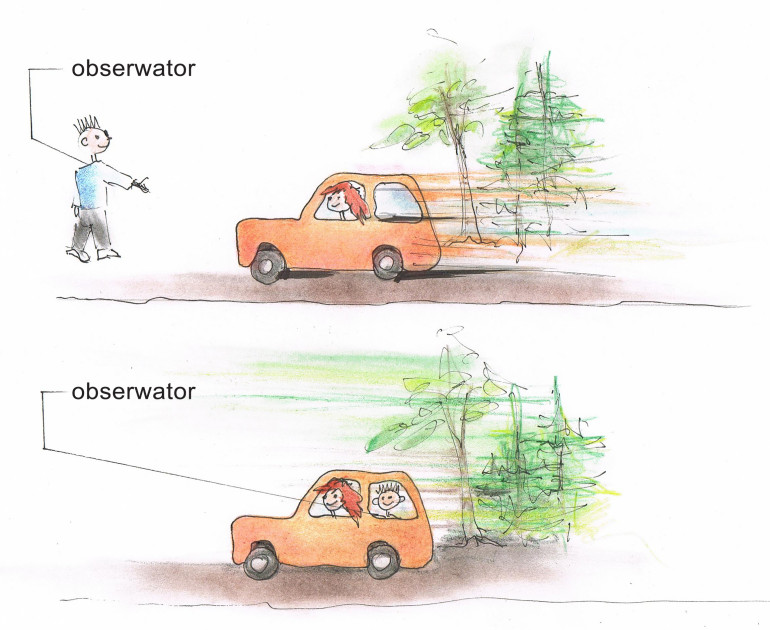 Obserwator stojący na drodze widzi zbliżający się do niego samochód. Jeżeli ten sam obserwator znajdzie się w środku samochodu, nie będzie się względem niego poruszał. Samochód stanie się dla niego nieruchomy, za to zacznie poruszać się całe otoczenie. Dokładniej, będzie przesuwać się do tyłu.