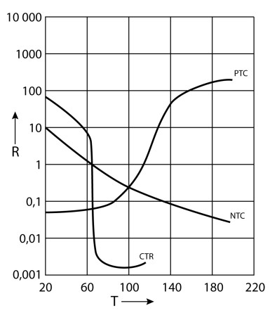 Termistory PTC działają zatem “prawidłowo” - zwiększają swoją rezystancję, kiedy wzrasta ich temperatura. Termistory CTR również najczęściej zwiększają swoją rezystancję, więc są stosowane w szczególny sposób, o czym dalej. Istnieją też termistory CTR, których rezystancja gwałtownie maleje.