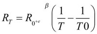 Współczynnik B (lub beta β) podawany jest w kelwinach [K]. Wraz z rezystancją R0 (oznaczaną często symbolem R25℃) umożliwia uzyskanie pełnej informacji o wartości rezystancji termistora dla konkretnej temperatury. T0 to temperatura odniesienia w kelwinach [K], a T to temperatura aktualna, również w kelwinach.