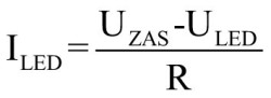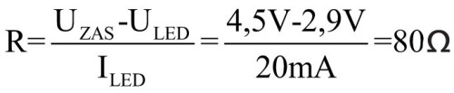 Napięcie zasilające diodę i rezystor pochodzi z trzech baterii, więc Uzas = 4,5 V. Jedna dioda potrzebuje prądu o natężeniu 20 mA i tyle możemy jej dać, aby świeciła możliwie jasno. Zatem ILED = 20 mA. Napięcie na diodzie warto przyjąć najniższe z możliwych (dlaczego – o tym za chwilę), czyli ULED = 2,9 V. Użyjmy wzoru rodem z XIX wieku, ale w nowoczesnej odsłonie: