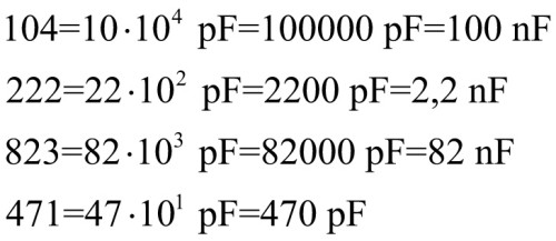 Podczas montażu zarówno płytki stabilizatora, jak i przedwzmacniacza, można natknąć się na elementy o oznaczeniach kodowanych. Najczęściej są to niewielkie kondensatory. Jak to odszyfrować? Reguła nie jest trudna: ostatnia cyfra określa liczbę zer do dopisania, a wynik jest w pikofaradach [pF]. Przykłady: