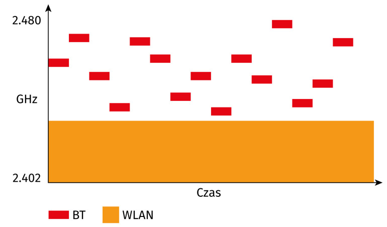 Sieć WLAN korzysta z pewnego wycinka pasma ISM 2,4GHz, zaś urządzenia Bluetooth ”skaczą” po całym paśmie. Jednak rzadko łączą się w obszarze zajętym przez WLAN, gdyż ono skutecznie zakłóca niskomocową transmisję Bluetooth.