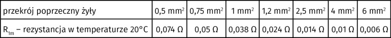 Na podstawie internetowego kalkulatora (https://lumier.pl/kalkulator/) wykonano tabelę, która zawiera rezystancję miedzianego, dwużyłowego przewodu o długości 1 m i określonym przekroju poprzecznym: