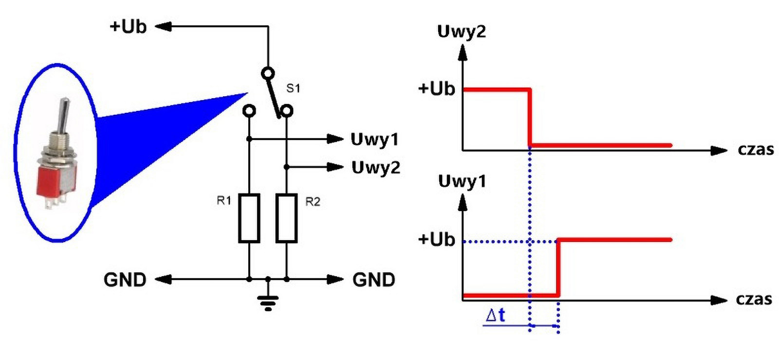 Powtórzyliśmy doświadczenie, tym razem z jednym ze znanych miniaturowych przełączników kołyskowych. Przełącznik S1 łączy napięcie zasilania +Ub z jednym z dwóch rezystorów: R1 lub R2. Podczas przełączania oba wyjścia przez pewien czas ∆t pozostają połączone z masą (GND), ponieważ w idealnym przypadku blaszka stykowa przez chwilę „wisi w powietrzu” pomiędzy dwoma stykami przełącznika.