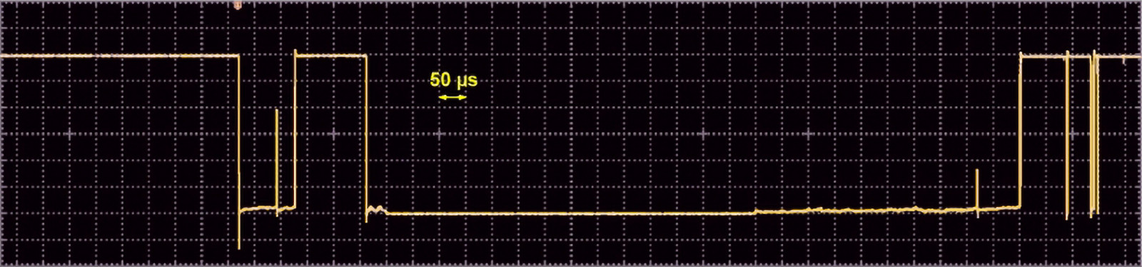 W praktyce jednak nic z tego nie jest prawdą! Zmontowaliśmy powyższy układ z tanim, chińskim przyciskiem i obserwowaliśmy przebieg napięcia na jego stykach za pomocą oscyloskopu. Na poniższym panoramicznym oscylogramie widać, jak zmienia się napięcie na przełączniku. Podczas naciśnięcia przycisku napięcie na stykach rzeczywiście spada do zera, ale po około 100 μs ponownie skacze do poziomu +Ub, ponieważ blaszka kontaktowa na chwilę odbija się z powrotem.