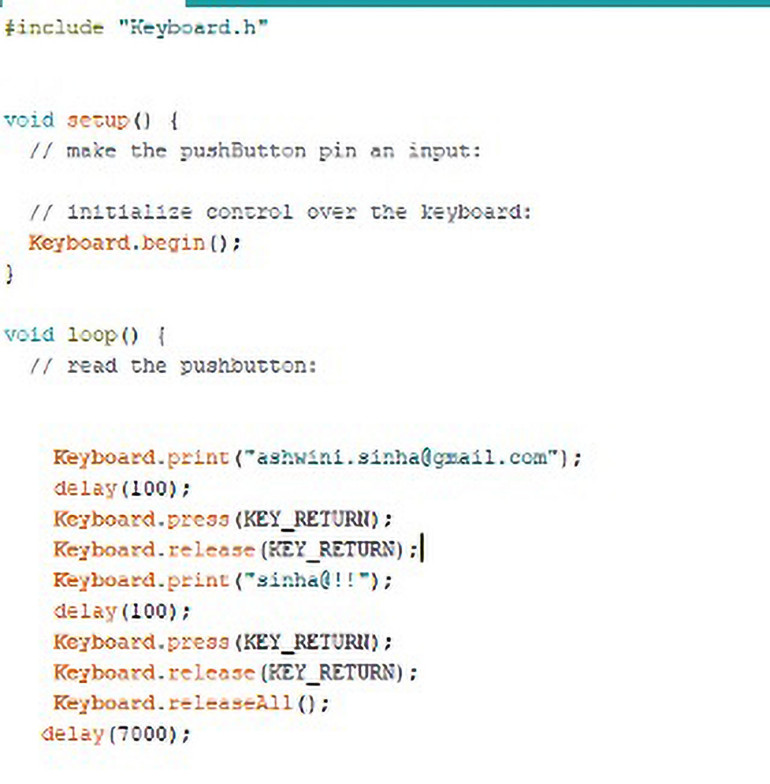 Należy zacząć od napisania poniższego kodu w Arduino IDE, aby Arduino Pro Micro działało jako HID do wprowadzania danych logowania do Netflixa, podobnie jak przy użyciu fizycznej klawiatury. W pierwszym kroku trzeba zainicjalizować w kodzie źródłowym biblioteki obsługi myszki i klawiatury, aby emulować wirtualną klawiaturę. Potem trzeba utworzyć funkcję setup(). Za pomocą funkcji loop() w kodzie, dane wejściowe z każdego naciśnięcia klawisza będą wirtualnie wprowadzane do Smart TV (tak jak w przypadku fizycznej klawiatury).