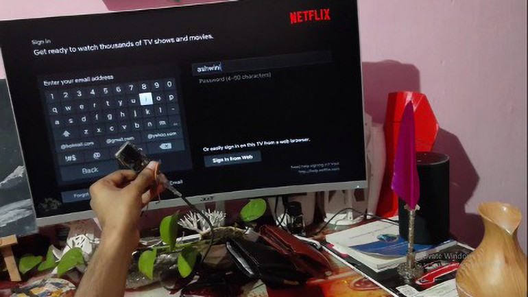 Pierwszą rzeczą, o którą pyta Netflix, jest nazwa użytkownika lub identyfikator e-mail konta Netflix. Wprowadź swój identyfikator e-mail (lub nazwę użytkownika) naciskając dowolny przycisk. Podobnie wprowadź swoje hasło, a następnie wybierz wirtualną opcję ENTER/OK. Należy utworzyć opóźnienie większe niż 20-30 minut, aby HID nie powtarzał często wprowadzanych danych.
