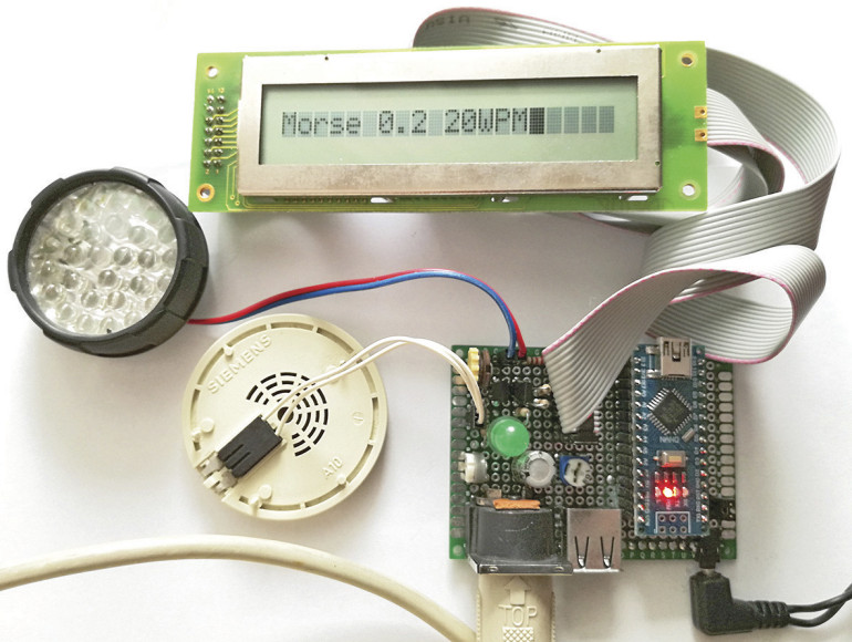Opisywany układ pracuje jako enkoder kodu Morse’a połączony z reflektorem LED, gdzie prędkość wysyłania znaków (WPM – words per minute) jest konfigurowana i możliwa do zmiany w trakcie nadawania. Znaki wpisywane na klawiaturze wyświetlane są na wyświetlaczu LCD oraz – po zakodowaniu – są asynchronicznie transmitowane przy użyciu elementów wykonawczych z wykorzystaniem światła. Głównym elementem nadajnika jest matryca LED z reflektorem (zdemontowana ze starej latarki czołowej), zbudowana z 28 białych diod elektroluminescencyjnych.