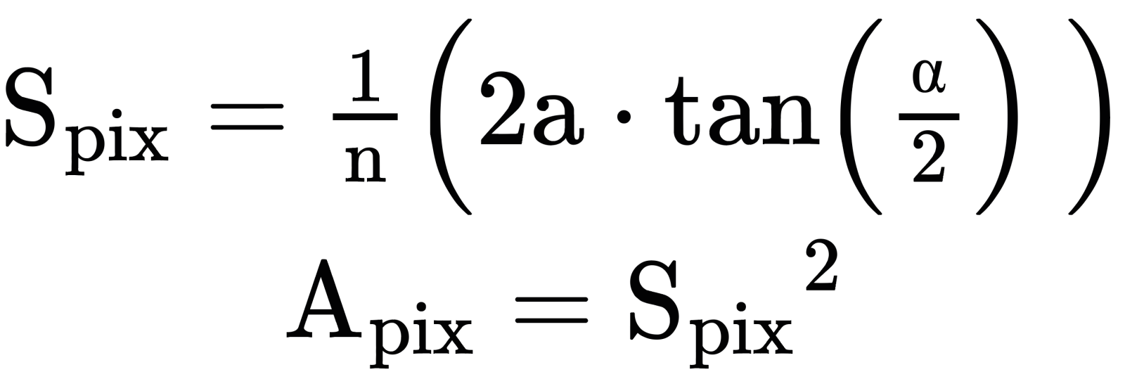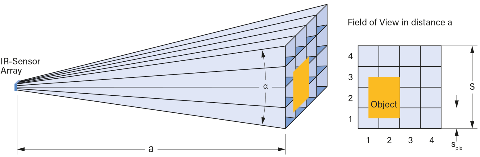 Ponieważ matryca jest kwadratem, kąty są sobie równe i oznaczone jako α. Dla każdej odległości obiektu a, w polu widzenia znajduje się widoczna powierzchnia o długości krawędzi S. Powierzchnia ta z kolei składa się z 16 indywidualnych powierzchni o długości krawędzi spix, z których każda jest przypisana do określonego piksela. Temperatura obiektu jest mierzona dokładnie tylko wtedy, gdy obiekt całkowicie pokrywa co najmniej jeden obszar częściowy. Wymóg ten można wykorzystać do obliczenia najmniejszego wykrywalnego rozmiaru obiektu dla określonej odległości a. W przypadku kwadratowej matrycy o wymiarach n×n pikseli obowiązuje następująca zasada: