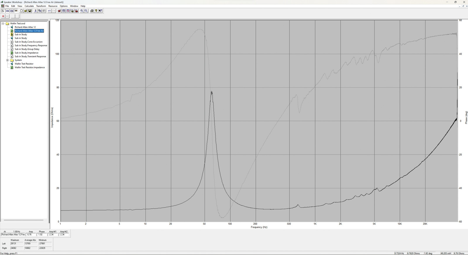 Rysunek 1 przedstawia przykładowy wykres impedancji i fazy 12-calowego głośnika niskośredniotonowego większej mocy, o częstotliwości rezonansowej 60 Hz. Przy tej częstotliwości, na wykresie fazy (kropkowanym) występuje raptowny skok od około +55° do –55°. Tego rodzaju wykres można oczywiście sporządzić ręcznie na papierze w oparciu o wyniki pomiarów z użyciem oscyloskopu. Komputer i karta dźwiękowa, uzupełnione naszą przystawką testową, mogą jednak wykonać tego rodzaju pomiar w ciągu kilku sekund.