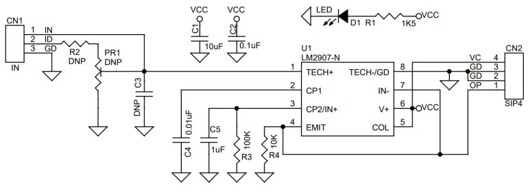 Zasadniczo jest to kondycjoner sygnału dla czujnika magnetycznego o zmiennej reluktancji stosowanego w silnikach lub maszynach do wykrywania prędkości obrotowej poprzez wykrywanie zębów kół zębatych. Poziom sygnału wejściowego wynosi od 20 mV do 28 V. Układ zapewnia napięcie 1 V (67 Hz/Volt), gdy częstotliwość wejściowa wynosi 67 Hz, przy zasilaniu 15 V. Maksymalna częstotliwość wejściowa wynosi 1 kHz. W projekcie wykorzystano układ scalony LM2907N-8. Więcej informacji na temat różnych konfiguracji można znaleźć w specyfikacji tego układu. Złącze CN1 służy do podłączenia czujnika lub sygnału wejściowego. Dioda D1 to LED zasilania, zaś zasila wejście CN2 i wyjście napięciowe. Użyjmy poniższego wzoru, aby obliczyć napięcie wyjściowe dla wejścia o żądanej częstotliwości.