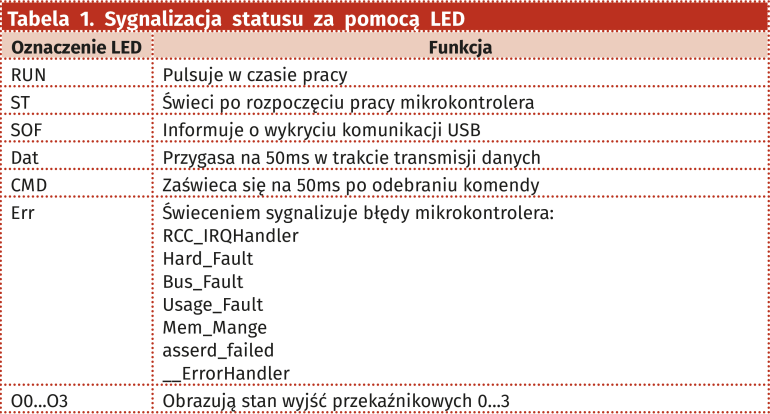 Głównym elementem modułu jest mikrokontroler STM32F103C8T6 z wbudowanym interfejsem USB pracującym w trybie device. Napięcie zasilania ze złącza USB jest obniżane w stabilizatorze SPX1117MP-3.3. Sterowanie przekaźników jest buforowane układem ULN2003. Przekaźniki mogą być zasilane napięciem +5 V z USB lub z zewnętrznego zasilacza. Maksymalne napięcie akceptowane przez bufor to +50 V. Moduł ma 4 wejścia cyfrowe wewnętrznie podciągnięte do zasilania. Sygnały wejść/wyjść cyfrowych wyprowadzono na złącze J9. Wejścia analogowe (J5) oraz SPI, I2C, USART, w aktualnej wersji oprogramowania nie są używane. W razie zainteresowania taką funkcjonalnością proszę o e-maile. Całość dopełniają diody LED informujące o statusie urządzenia (tabela 1).