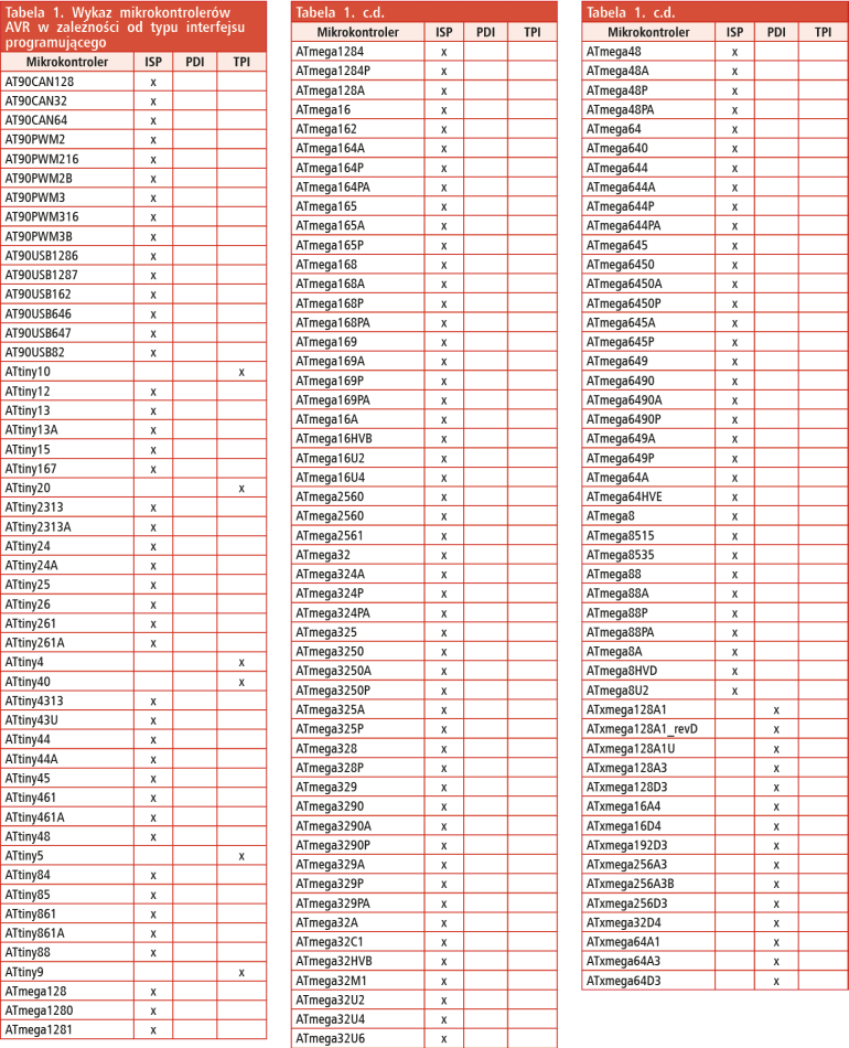 W tabeli 1 umieszczono wykaz najbardziej popularnych mikrokontrolerów AVR z określeniem typu interfejsu służącego do ich programowania. Jak można zauważyć, większość mikrokontrolerów AVR jest programowanych za pomocą interfejsu ISP, ale niektóre (np. nowe, w obudowach 6-wyprowadzeniowych) z rodziny ATtiny są programowane za pomocą interfejsu TPI, a mikrokontrolery z rodziny ATXmega za pomocą interfejsu PDI.