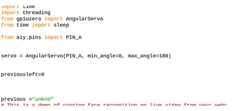 Zaimplementuj kod rozpoznawania twarzy, który został wcześniej napisany dla projektu robota do rozpoznawania twarzy, a następnie zaimportuj kilka nowych bibliotek do kodu. Upewnij się, że zaimportowałeś bibliotekę gpiozero do kodu, aby sterować serwomechanizmem. Następnie ustaw numer pinu Raspberry Pi do sterowania serwomechanizmem. Można użyć dowolnego pinu PWM Raspberry Pi. Do Raspberry Pi został dołączony Bonnet, którego pin A (a nie pin Raspberry Pi) umożliwia bezpośredni dostęp do sterowania serwomechanizmem.