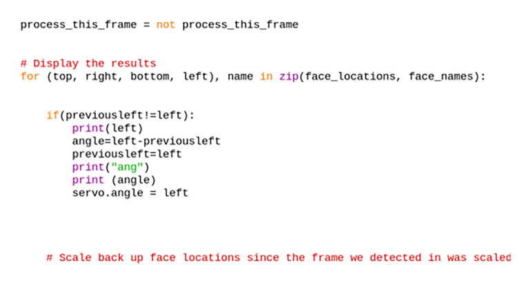 Napisz dwa różne kody: jeden do śledzenia obiektu docelowego, a drugi do śledzenia twarzy i kamery. Kamera uzyskuje współrzędne x i y twarzy, a następnie przekłada je na kąt ruchu serwomechanizmu. W kodzie śledzona jest tylko współrzędna x serwomechanizmu, a nie ruch y twarzy. Można jednak dodać jeszcze jeden serwomotor, aby śledzić ruch twarzy we współrzędnej y.