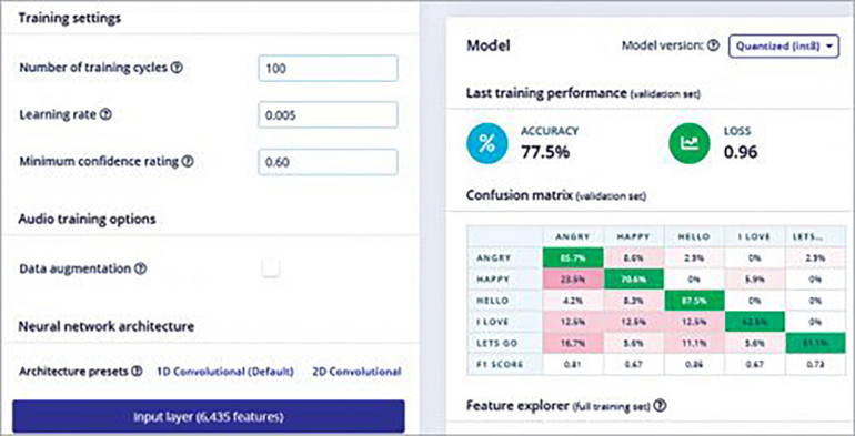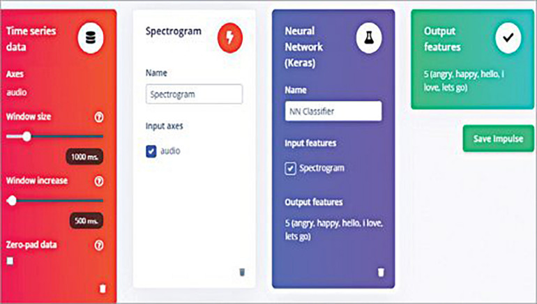 Wybierz bloki uczenia i przetwarzania do trenowania modelu ML. W tym przypadku użyto Spectrogram dla bloku przetwarzającego i Keras dla bloku uczącego. Używając ich, wyodrębnij różne parametry audio do szkolenia modelu ML, aby uczyć model z zestawów danych. Następnie przetestuj model i udoskonalaj go, aż będziesz zadowolony z jego dokładności.