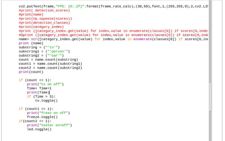 Urządzenie musi rozpoznawać urządzenia, które wymagają sterowania za pomocą komend wysyłanych wzrokowo. Dlatego poniższy kod pozwala nam na przechwytywanie filmów w czasie rzeczywistym w celu wykrywania obiektów i włączania lub wyłączania urządzeń.