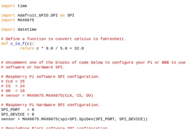 Najpierw zaimportuj do kodu bibliotekę daty i czasu, a następnie bibliotekę MAX6675. Następnie zdefiniuj port SPI, z którego będziesz korzystał. Ponieważ ten projekt wymaga użycia sprzętowego SPI, w tym celu dodano odpowiednią część kodu do jego obsługi.