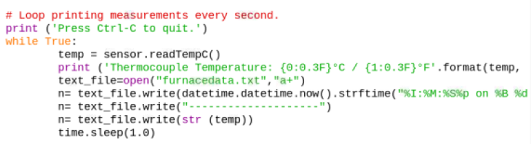 W kolejnym kroku zapisz dane z czujnika wraz z datą i czasem, aby umożliwić monitorowanie pieca i innych wysokich temperatur przemysłowych. Utwórz pętlę while, która będzie aktualizować temperaturę z czujnika. Potem, zapisz je w pliku furnacedata.txt jako bazę danych.