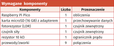 Komponenty wymagane do realizacji projektu przedstawiono w tabeli poniżej.
