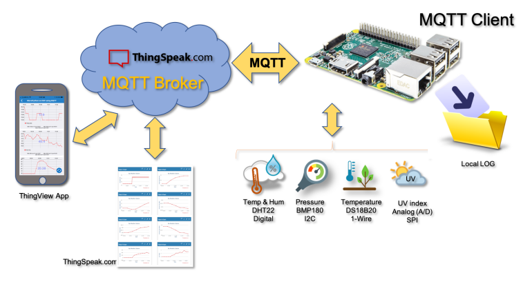 W skrócie, wszystkie dane będą przechwytywane, zapisywane lokalnie w pliku CSV i wysyłane do serwisu IoT (ThingSpeak.com), poprzez protokół MQTT, jak widać na poniższym schemacie blokowym: