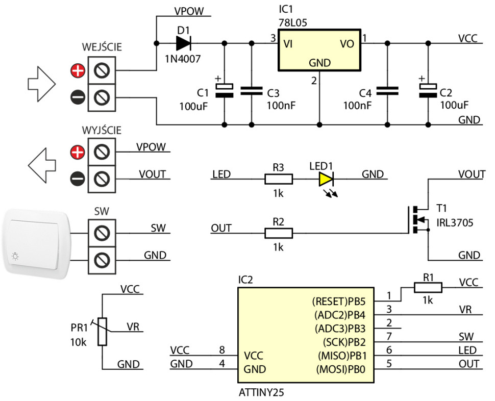 Schemat ideowy sterownika pokazano na rysunku 1. Układ włączany jest między źródło zasilania a odbiornik. Musi on być zasilany napięciem stałym, może to być akumulator lub dowolny zasilacz o wydajności prądowej odpowiadającej dołączonemu obciążeniu. Dioda D1 zabezpiecza układ przed dołączeniem napięcia o niewłaściwej polaryzacji. Napięcie wejściowe jest podawane na stabilizator IC1 typu 78L05 dostarczający napięcia 5 V, a kondensatory C1...C4 zapewniają odpowiednią filtrację tego napięcia. Pracą układu steruje mikrokontroler IC2 typu ATtiny25. Elementem wykonawczym jest tranzystor T1 typu IRL3705.