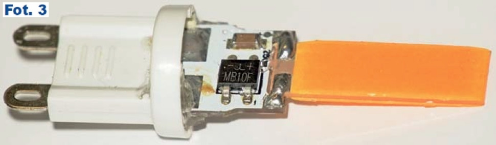 - Fot. 3 – cokół G9, filament, luminofor COB, liniowe ograniczenie prądu w postaci układu CYT1000B, kondensator filtrujący za mostkiem prostowniczym o wartości tylko 10nF, nieznana liczba diod LED.
