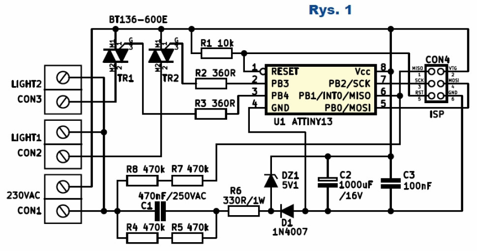 Zaprogramowanie mikrokontrolera można przeprowadzić w układzie, zasilając z programatora (dioda prostownika blokuje przepływ prądu przez diodę Zenera). Przed uruchomieniem należy sprawdzić, czy nie ma zwarcia, szczególnie w obszarze końcówek triaków.