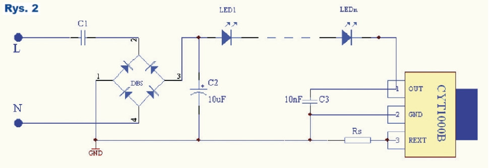 Rzut oka w dokumentację zastosowanego liniowego stabilizatora prądu potwierdza te obawy. W jednej z kilku aplikacji, przedstawionej na rysunku 2, producent informuje o napięciu pracy 270–285V, co świadczy o tym, że sterowanie za pomocą impulsów podawanych na bramkę w tym przypadku się nie sprawdzi.