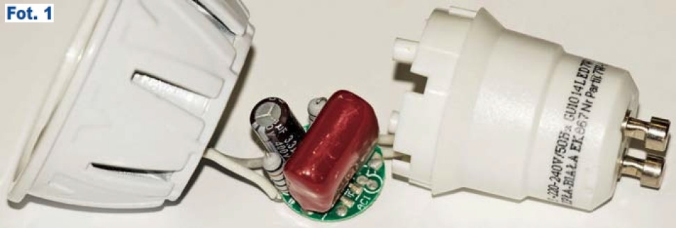 - Fot. 1 – cokół GU10, zasilacz z reaktancyjnym ograniczeniem prądowym, 14 diod połączonych w szereg, na każdej z nich spadek napięcia około 10V, co daje w sumie 140V napięcia zasilającego moduł z diodami LED.