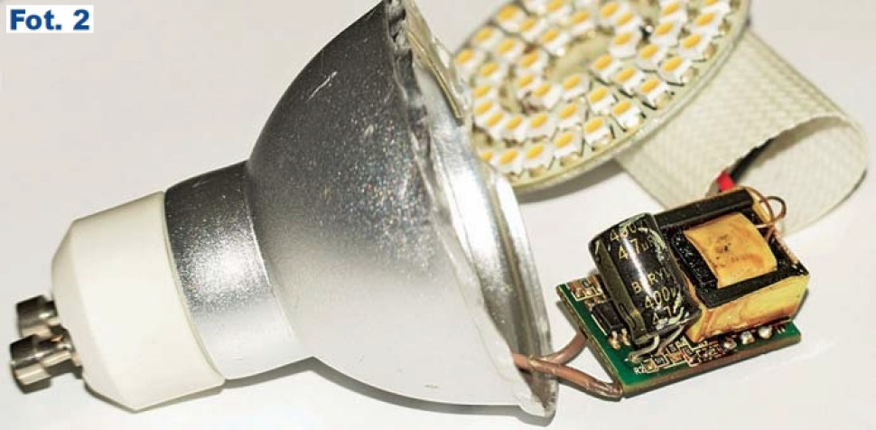 - Fot. 2 – cokół GU10, przetwornica obniżająca, 60 diod LED w konfiguracji szeregowo połączonych 6 zespołów po 10 diod równolegle, 2,4V spadek napięcia na pojedynczej diodzie, co daje napięcie zasilania modułu LED 14,4V.